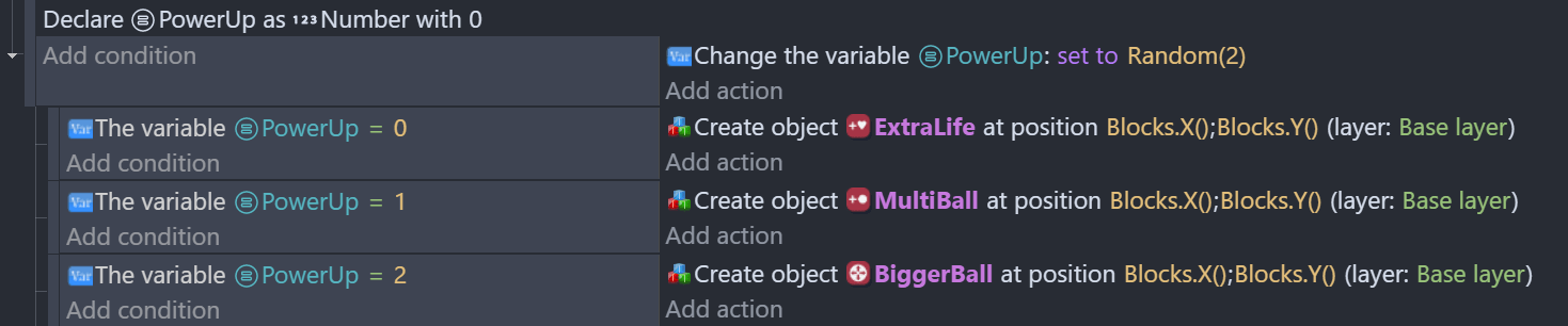 Local variables can also be used within a loop, but in this case its value is reset at every repetition. For instance, the following events create 8 platforms overlapping each other.