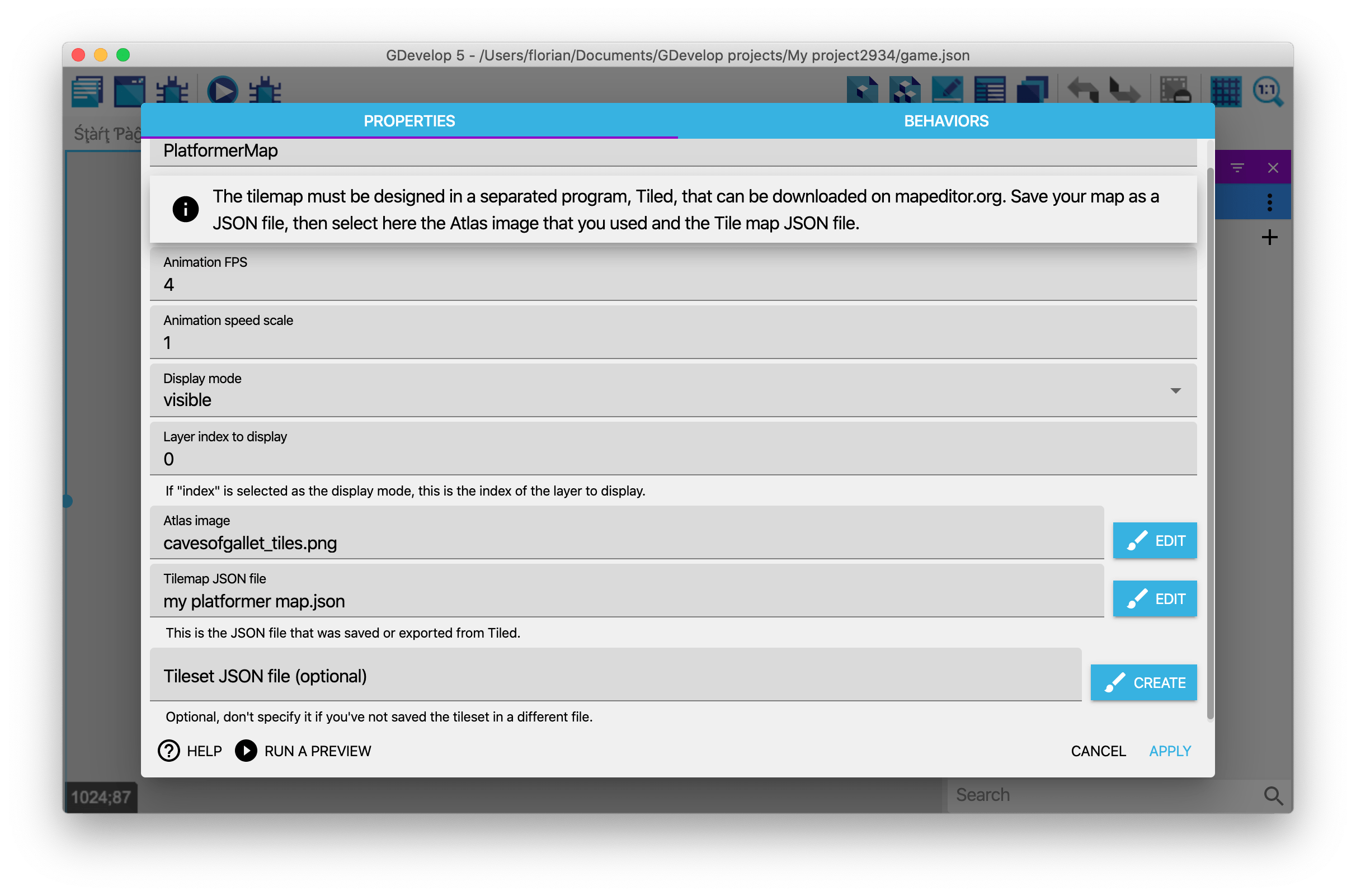 Finally, choose the tileset file in GDevelop, in addition to choosing the atlas image and the tilemap JSON file: