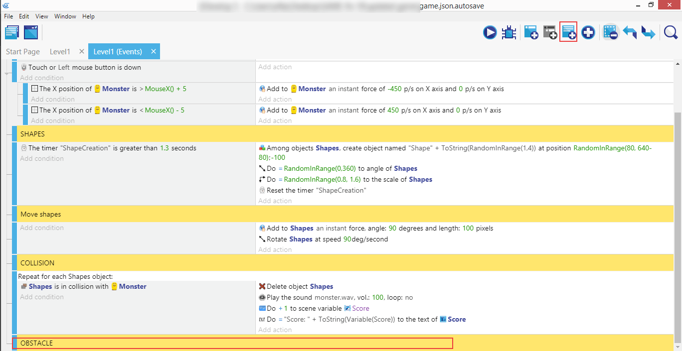 Next create a new event above the obstacle event and give it the condition “at beginning of the scene”, and copy/paste the earlier create “Start (or reset) a scene timer” action for “ObstacleCreation” to this new event. This will start the timer at the beginning of the game in so the obstacle event will trigger the first time.