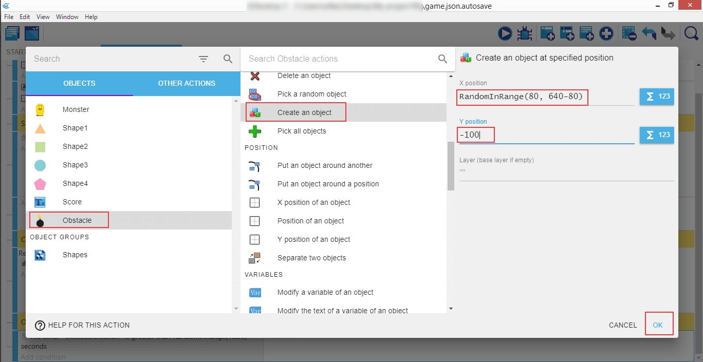 Now the action - select the "Obstacle", search for "Create an object", and set the "X position" to RandomInRange(80, 640-80), and "Y position" to -100. It's the exact same approach as with shapes.